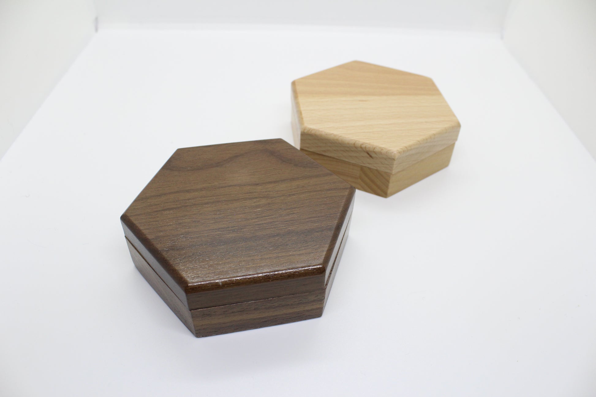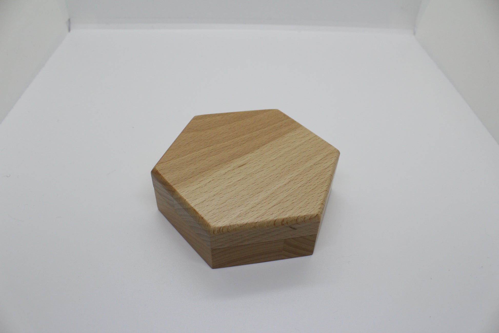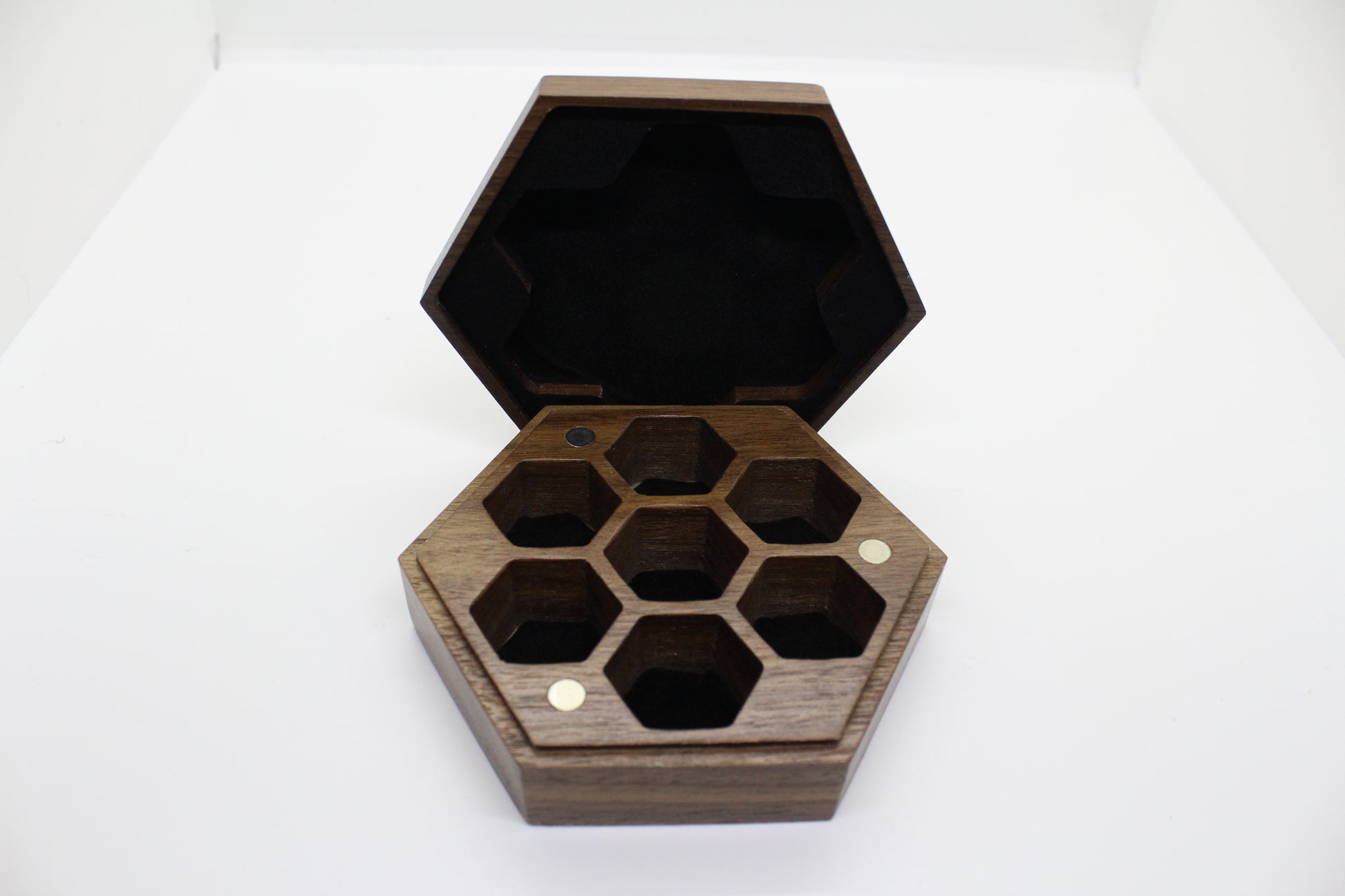 Hexagonal trälåda med plats för 7 tärningar: en av varje sort i ett RPG set.